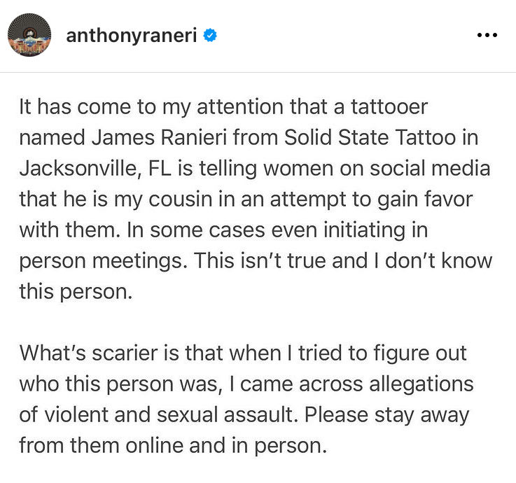 A former Jacksonville tattoo artist identified by dozens of women on social media as being the perpetrator of unwanted sexual advances has been arrested. A popular tattoo artist is being. James Ranieri 36 was arrested in Volusia County as a result of.